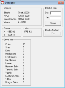 El botón “Bloques ordenados” en el cuadro Depurador de SMBX se puede utilizar si desea realizar colisiones NPC de desorden, de modo que caigan a través de bloques. El botón se activará cuando coloque algunos bloques en el nivel.
